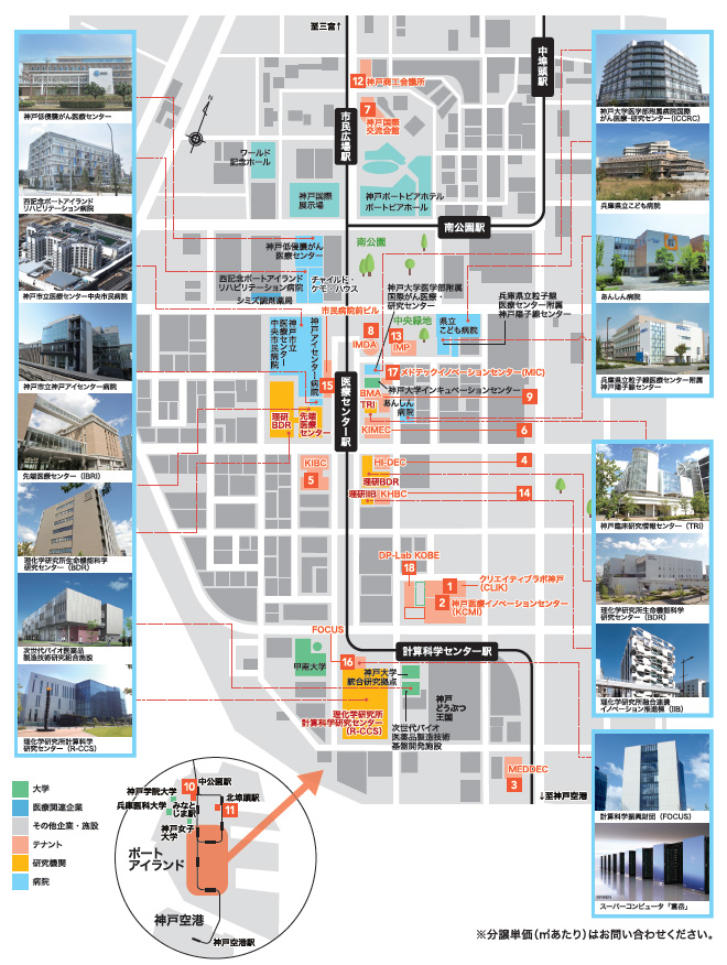1998年から神戸市のプロジェクトとして始動し、理化学研究所や大学等の研究機関、神戸市立医療センター中央市民病院をはじめとした高度専門病院群、医療関連企業・団体がポートアイランドに集積しています。