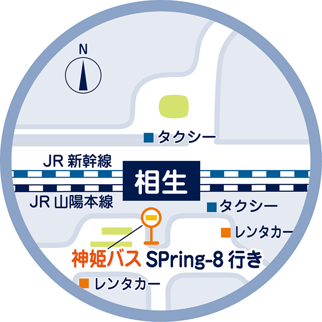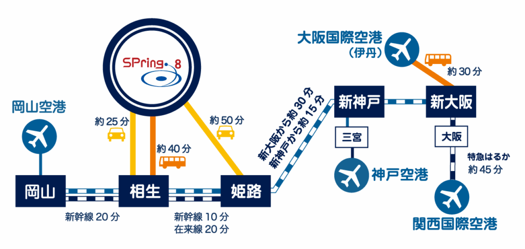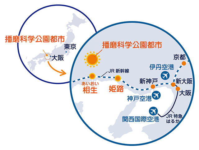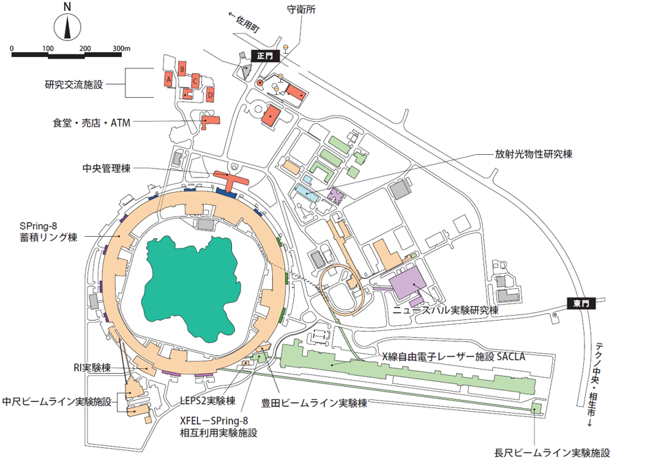 SPring-8は、兵庫県の南西部に位置する播磨科学公園都市にあり、SPring-8、SACLAの他、関連研究施設や研究をサポートする施設等から構成されています。