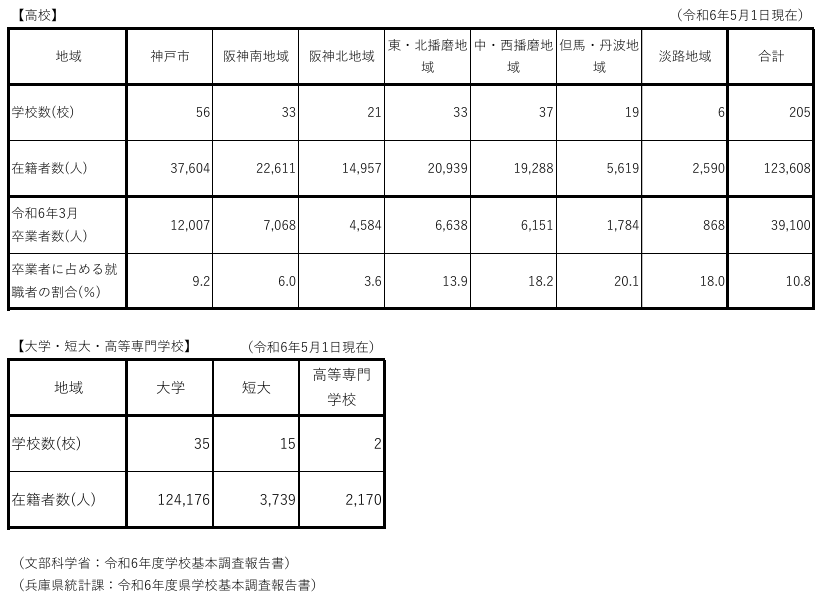 本県には、神戸・阪神を中心に教育機関が集積し、36の大学、15の短期大学があり、大学等進学率は67.1%、大学・短大合わせた学生数は、約13万3千人に達します。